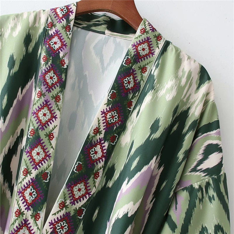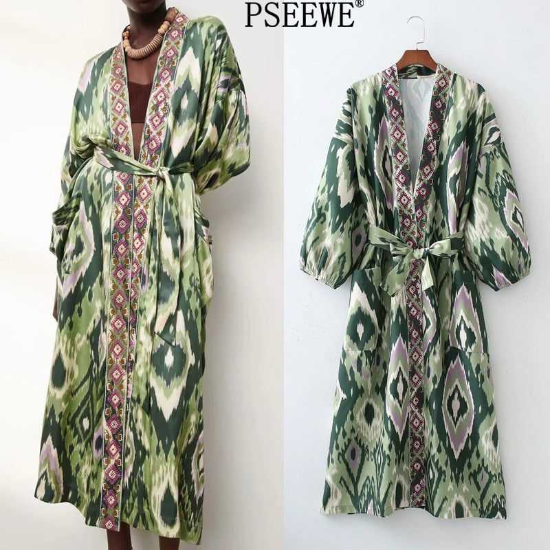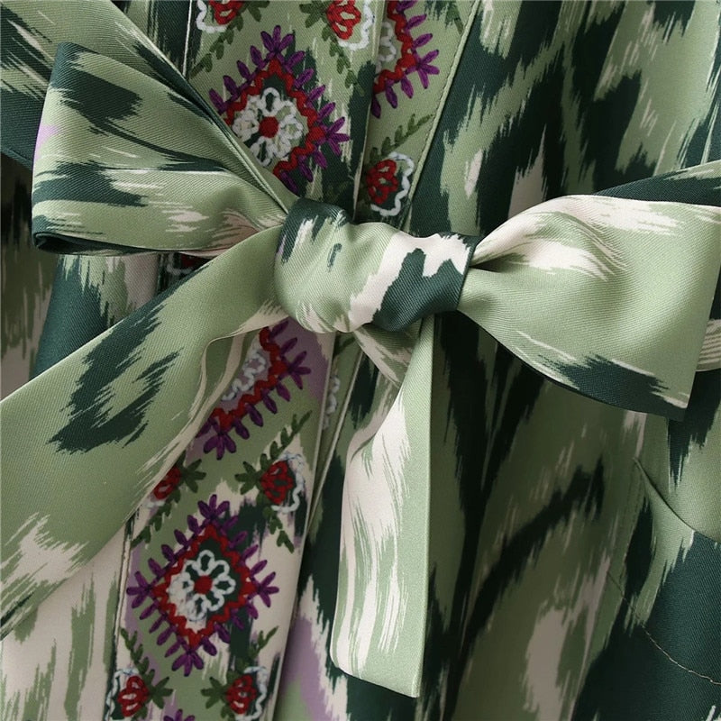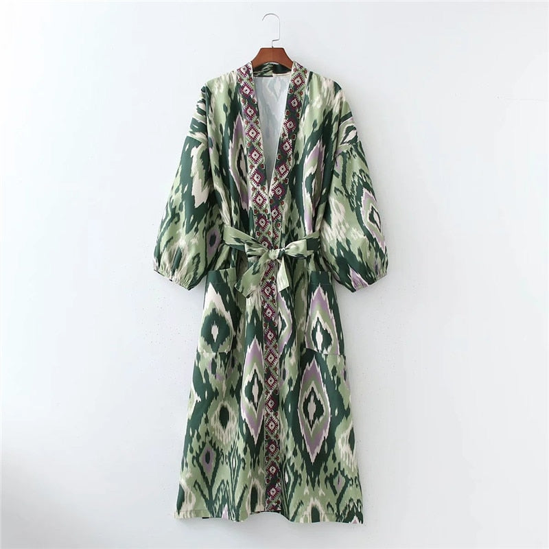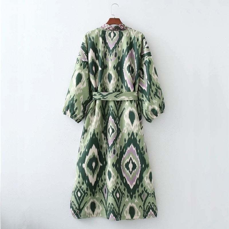 • Puff Sleeve Bohemian Style Robe Wrap Dress with Belt